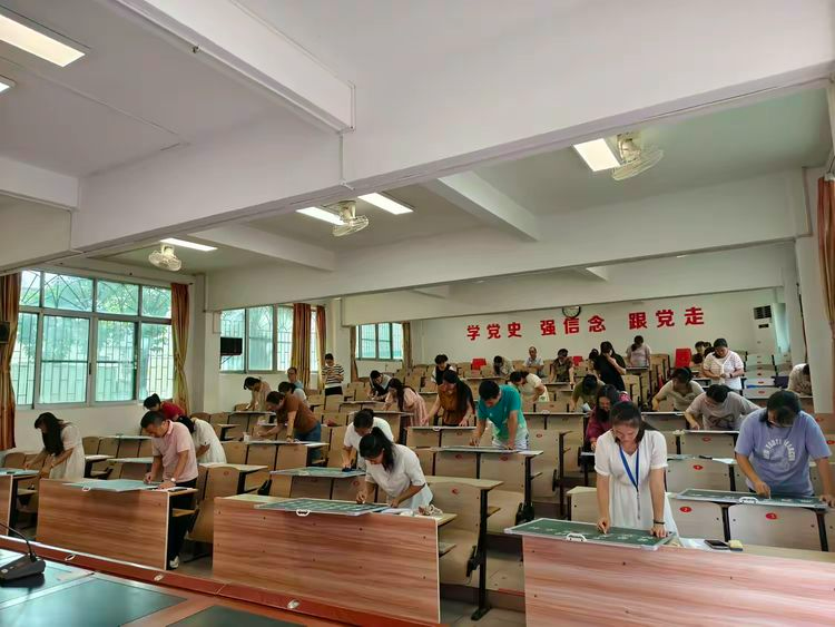 “粉筆飛花凝匠心,筆端自有漢風揚” 。 比賽現(xiàn)場,參賽者屏息凝神,一支支粉筆在指尖飛舞。他們或頓挫有致,或行云流水,橫平豎直盡顯嚴謹,落鋒收筆巧藏匠心。短短幾分鐘,一幅幅富有個性的作品便呈現(xiàn)在大家面前:有的老師字體端莊秀麗,筆畫舒展流暢,盡顯楷書的工整規(guī)范;有的老師筆鋒剛勁有力,結構疏密有致,蘊含行書的靈動韻味,各具特色。這場比賽中,每一位參賽教師都全情投入,撇捺間盡顯師者風采,橫豎中詮釋漢字優(yōu)雅。