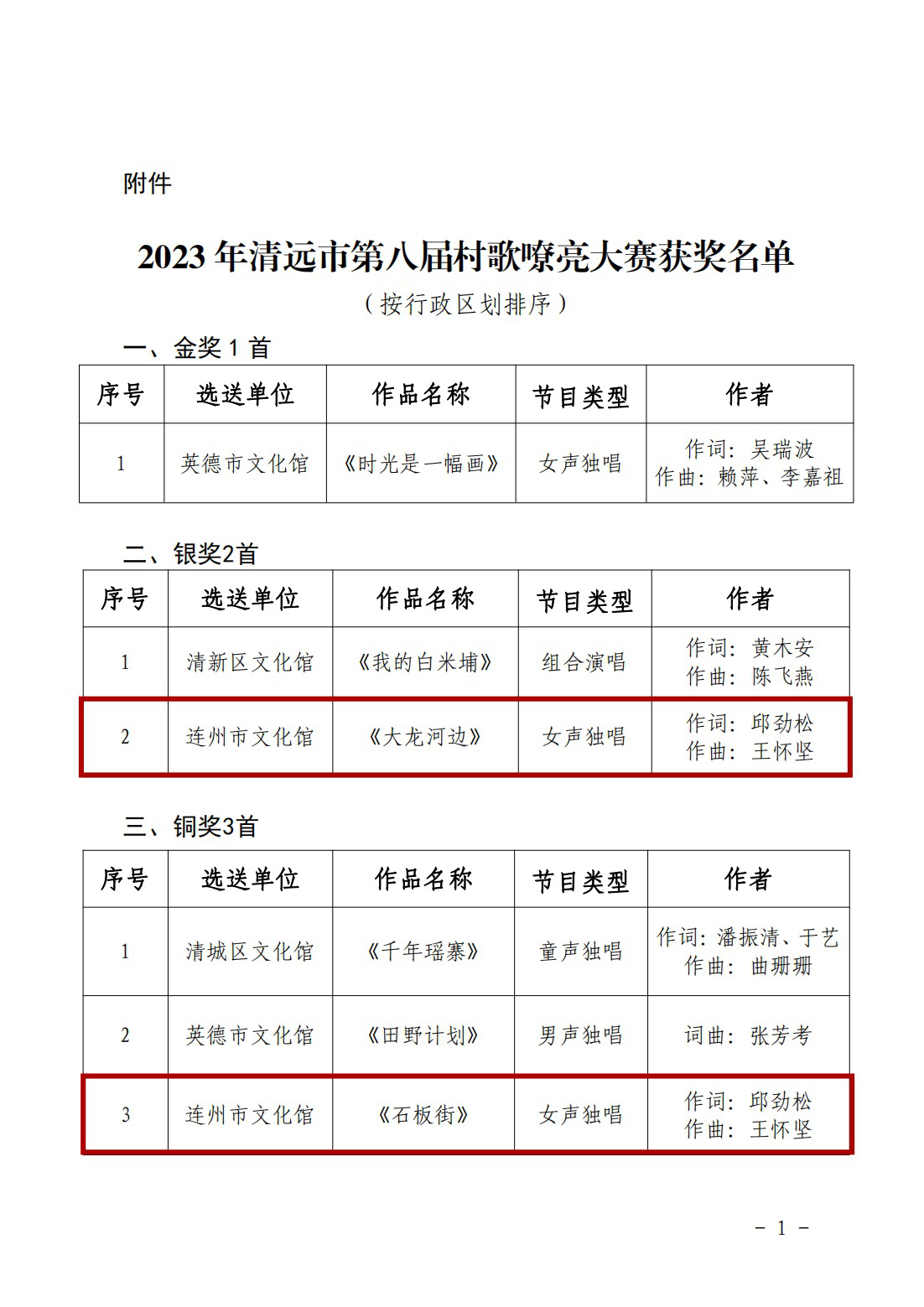 4月2日,2023年清遠市第八屆村歌嘹亮大賽頒獎儀式在清遠市江心島一墨書房隆重舉行。連州市選送的女聲獨唱《大龍河邊》榮獲銀獎、最佳演唱獎,女聲獨唱《石板街》榮獲銅獎、最佳作詞獎,男聲獨唱《水路田》榮獲最佳作詞獎。